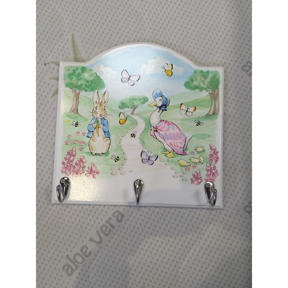Coat hook with 3 hooks, and beautiful hand painted artwork featuring Peter Rabbit and Jemima Puddleduck. To celebrate 150 years of Beatrix Potter! You can choose 2 of your own favourite characters and we will hand paint them for you. Silver or gold hooks. The perfect Christening gift!