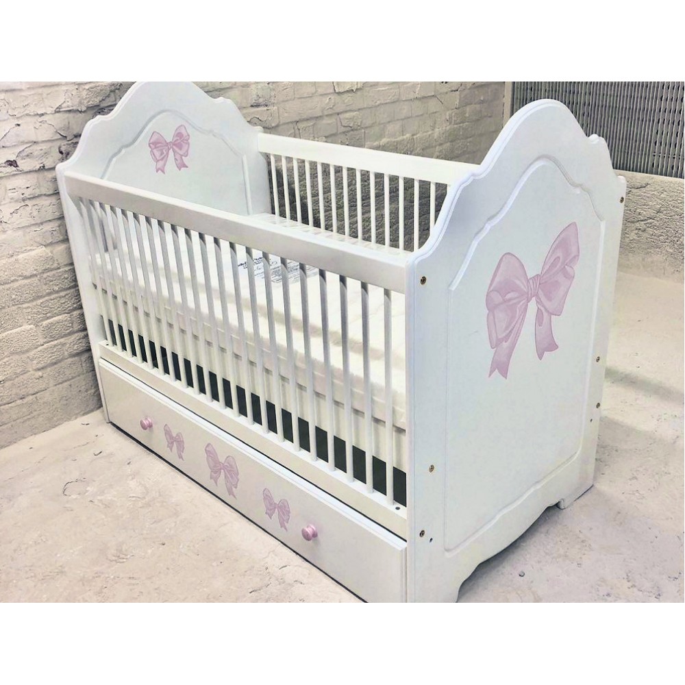 Cot with pink hand painted Magda bows. This item has 2 height settings and is supplied with a bespoke mattress.
