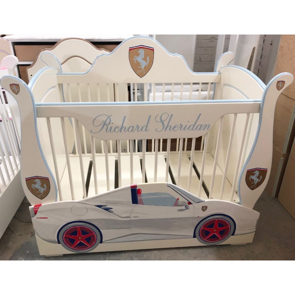 Ferrari personalised cot made to fit in our clients dining area in a caravan. Cot shown has a lovely pull out drawer for valuable storage space. Made not to wobble or tip over. 50" wide x 28" deep. Can also be made to cover a boxed in wheel arch (under the table). We make many different cots in all different styles. You can choose your own car and colours. Price includes a bespoke mattress too. Please allow 8-12 weeks for us to make you a cot!