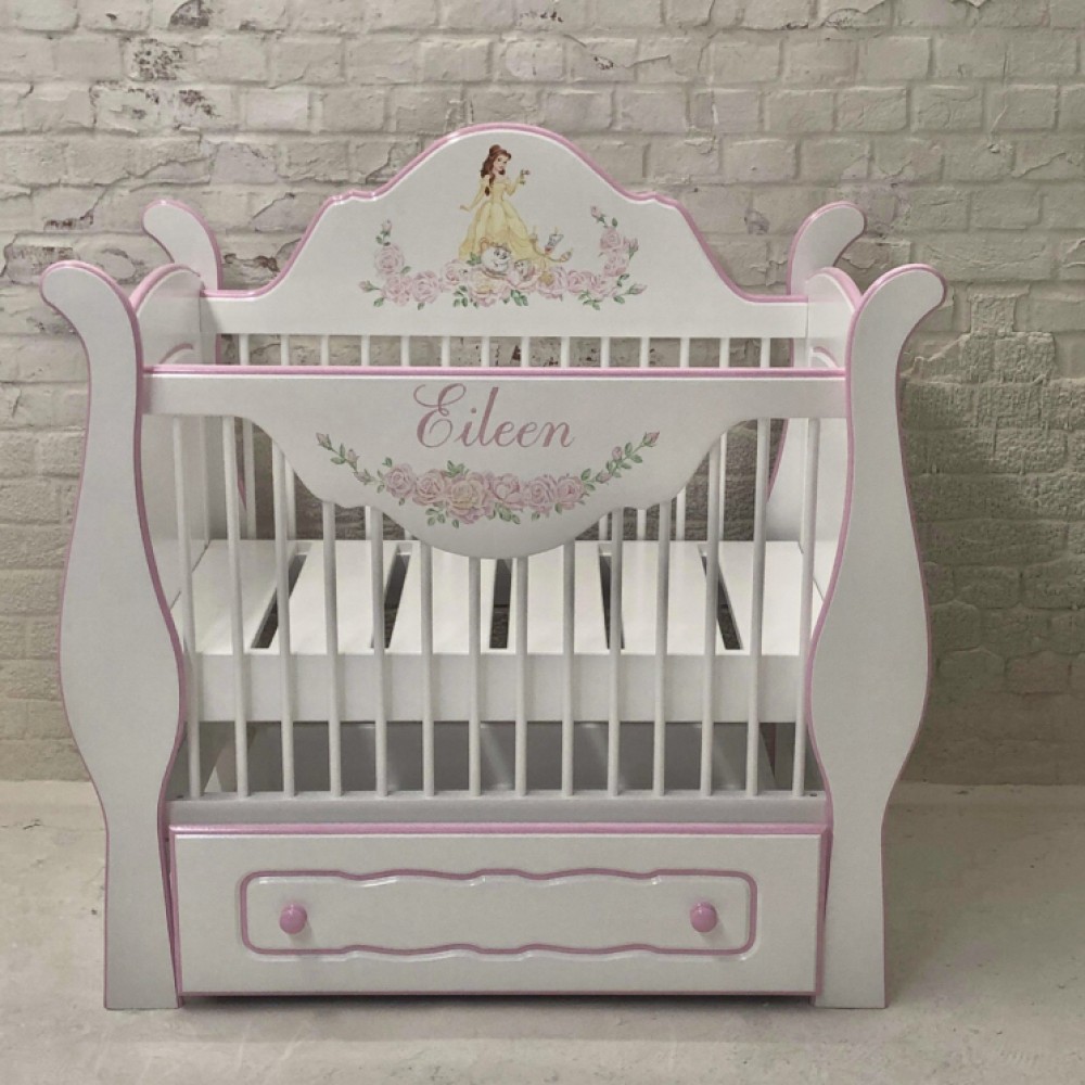 Delightful little miniature small size hand painted cot with Belle artwork. Including your babies name. We make cots to order in all sizes no matter how small. Item shown is off white/pink with hand painted art to match our customers bedding. Supplied with mattress.