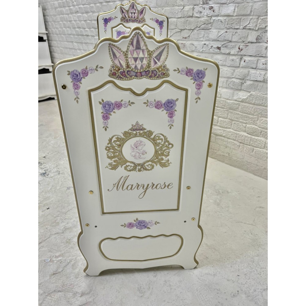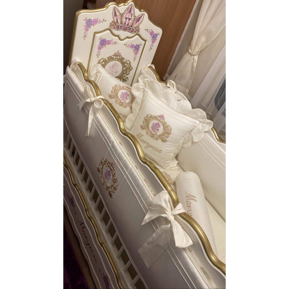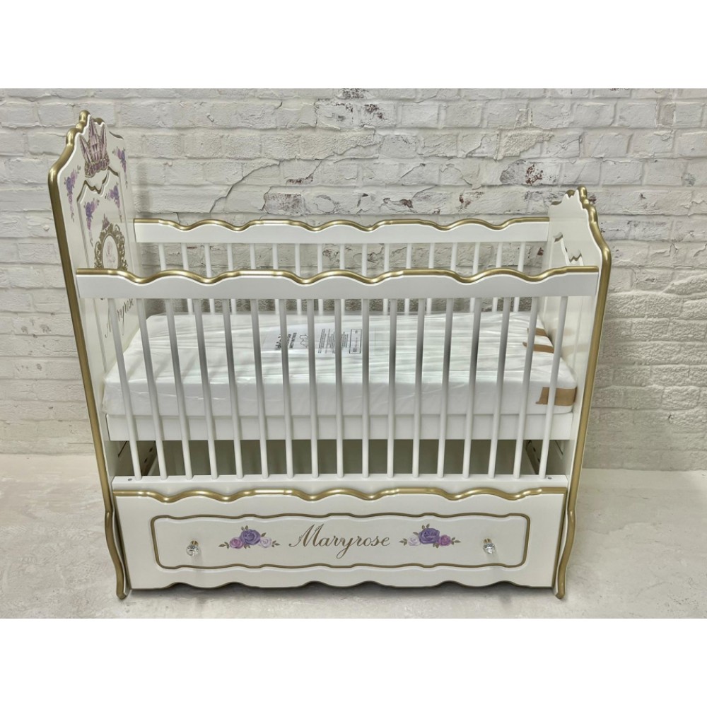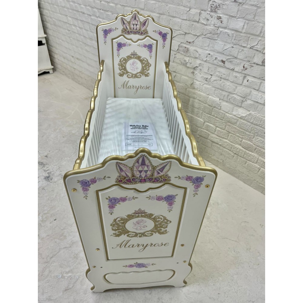 One of the most beautiful cots we have ever made. Especially made and hand painted for Maryrose. Off white with gold and artwork chosen by mummy. The result is stunning.