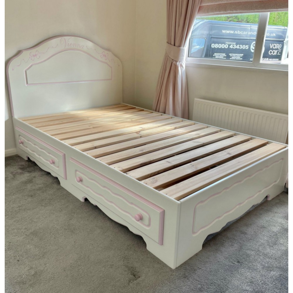 Small double Danny bed with 2 storage drawers which you can switch to other side depending on the room layout. Bed shown in white with woolnaugh pink edging colours. Mattress not included.
