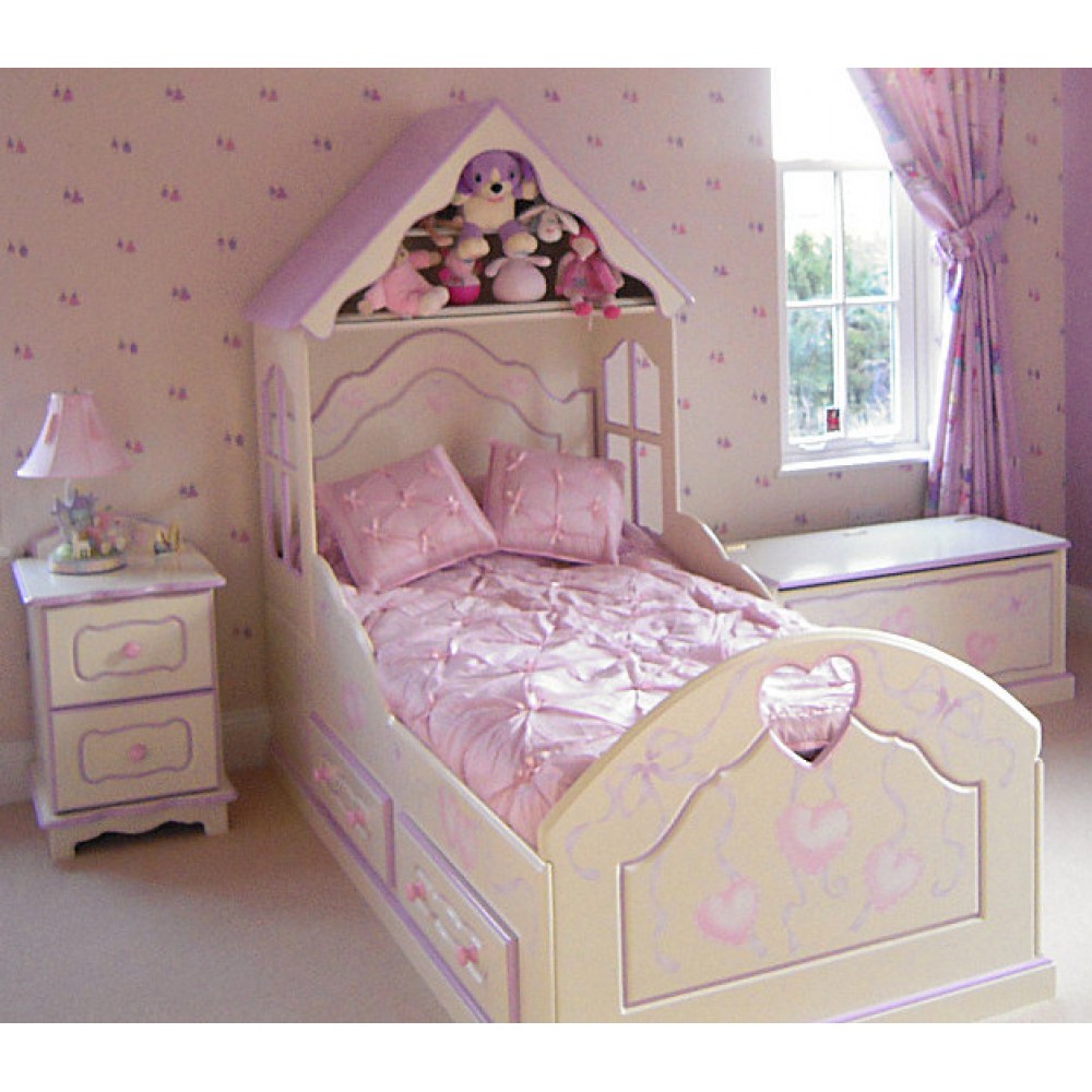 Maddies first bed, specially made by Chartley! A dolls house bed hand made and painted to match this stunningly beautifully decorated little girls bedroom! Furniture is off white with pink and lilac trim colours. Artwork as chosen by customer, to compliment the curtains and wallpaper. What a dream bedroom!