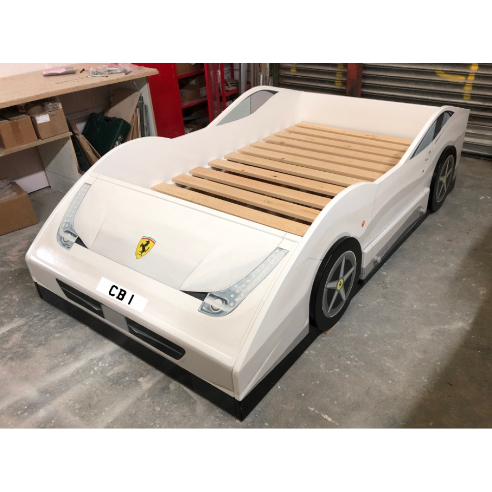 Hand made to order, and hand painted to look like a real car! White Ferrari bed, with a storage drawer each side for tools etc. Bed shown is a small double so mummy and daddy can get in for a cuddle! Will not break! Could also be a red Ferrari!! Bespoke, to order. Exc. mattress. Bedding not included!!