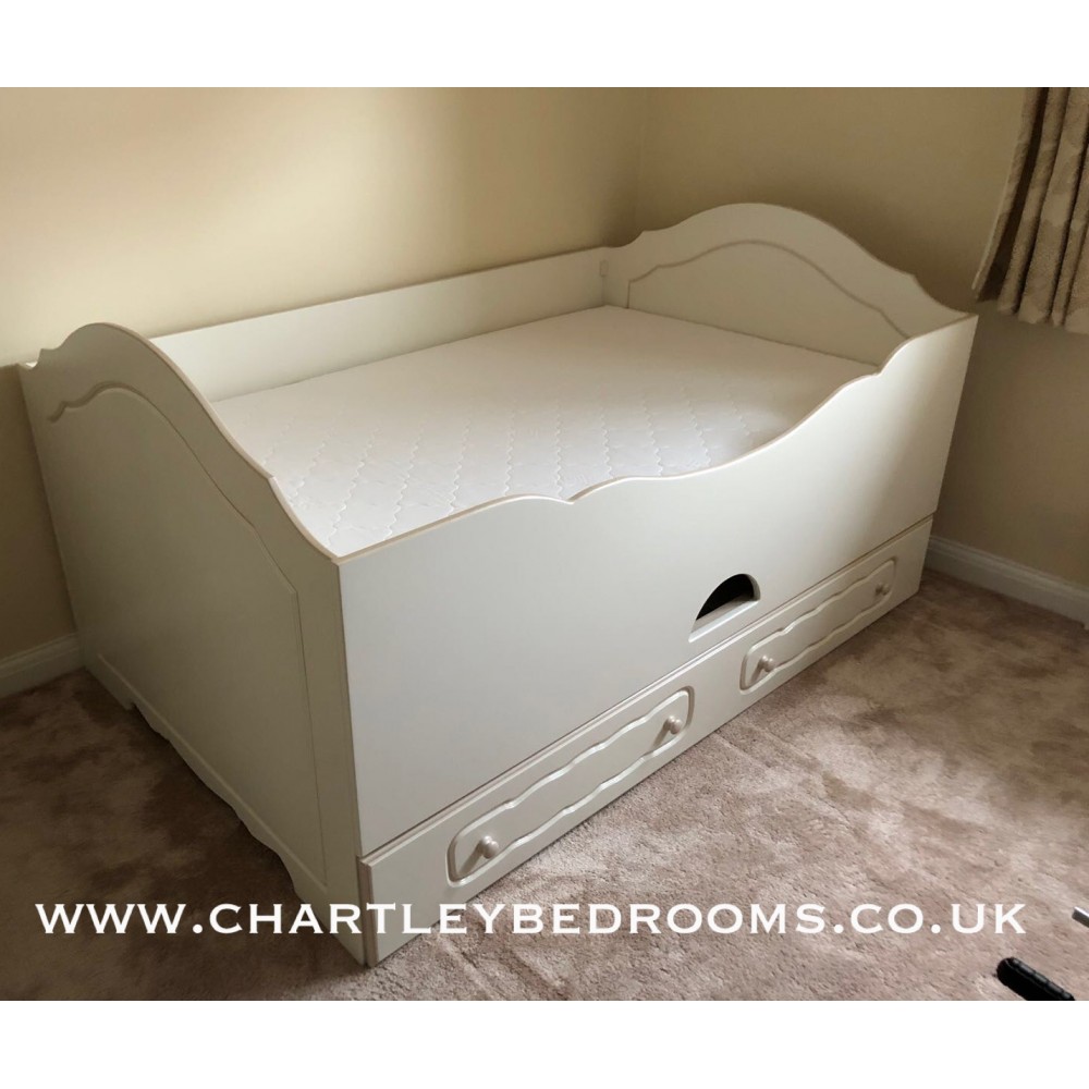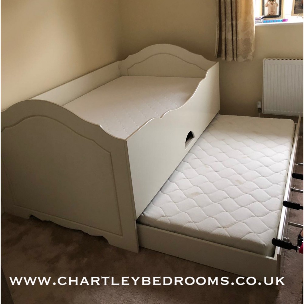 Small double cabin bed (takes a small double mattress 120cms not included) with a 3rd single bed under - mattress not included and it is a shorter one. Bed shown in off-white with darker edging colour. Perfect for sharing! Ideal guest bed for the grand children. Can be made bespoke - call for further information.