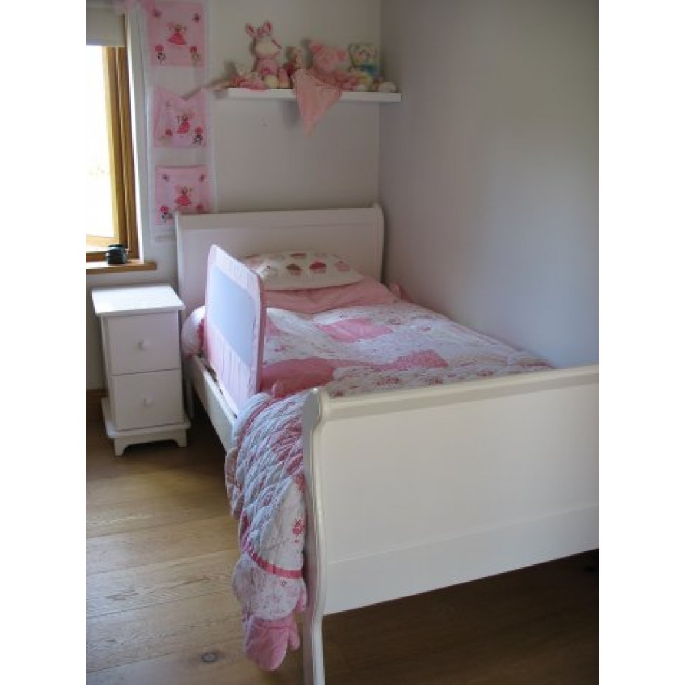 Sleigh bed in pure white - the perfect choice for your child's 1st bed. Can be made any size as all Chartley furniture is hand made in our Kent workshops. Keep us busy and buy British! Non standard size mattress also available. (Bed guard is clients own). Price excludes mattress.